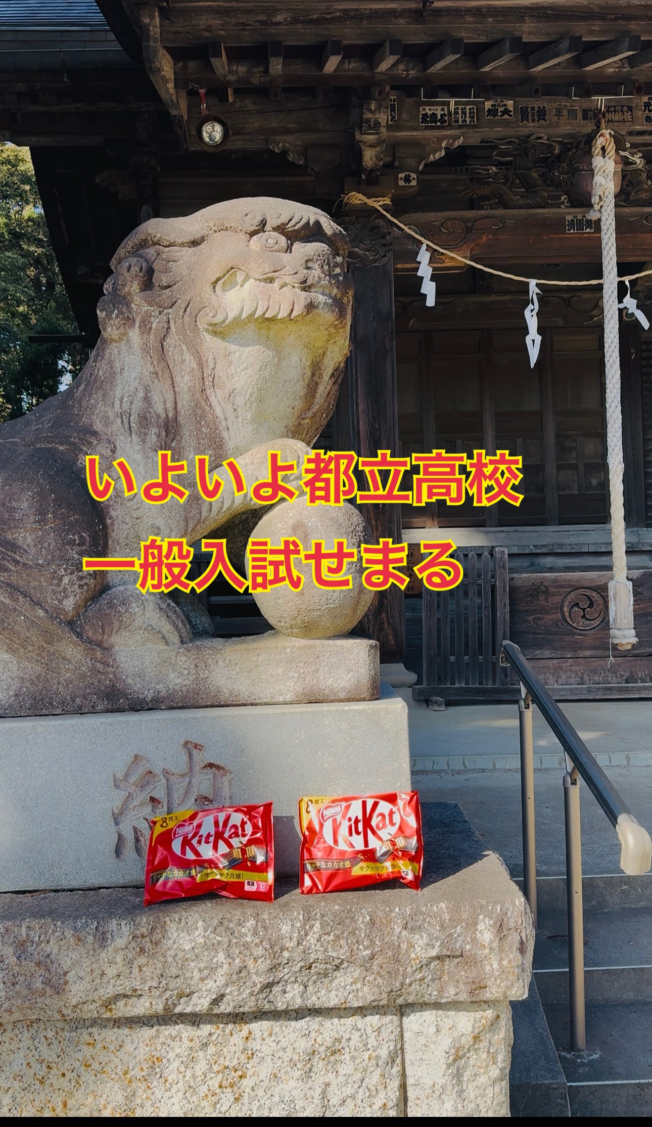 受験合格の定番チョコ、キットカットを地元の八幡様に持って行き合格祈願しました。