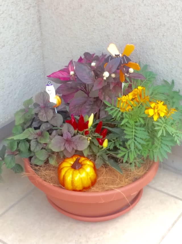 これはアユモ教室の玄関にスタッフが飾ってくれたハロウィン寄せ植えです
