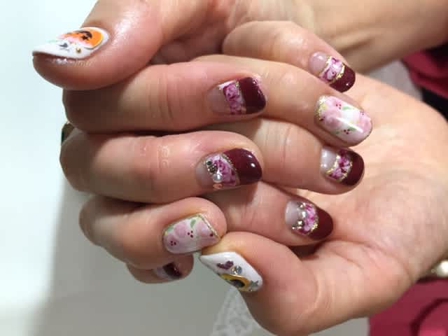他の指は、秋の訪れを感じさせるシックなマーブルと、落ち着いた色あいの薔薇の花。