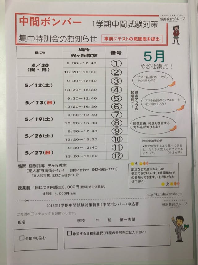 連休中の4月30日から中間ボンバー(中間試験対策特訓)が始まります