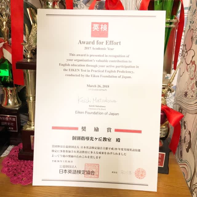 そのためか、おかげさまで英検協会より今年も奨励賞を頂き、2年連続の受賞となりました