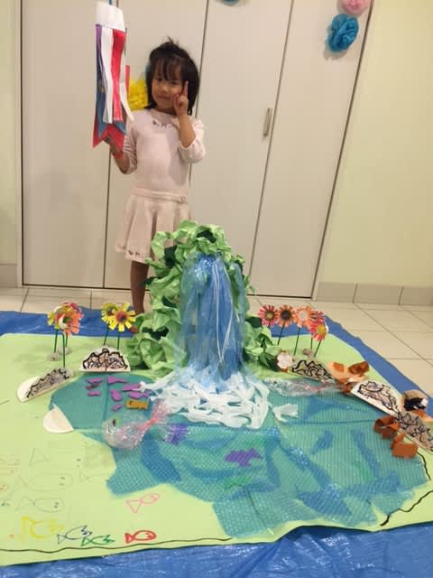 ペットボトルや紙コップで山を作り、割り箸や段ボールでお花を。廃材を利用しています。