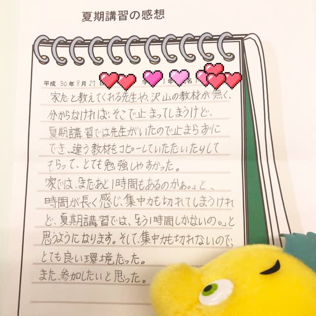 家だと教えてくれる先生や、沢山の教材が無く、分からなければそこで止まってしまうけど、夏期講習では先生がいたので止まらずにでき、違う教材をコピーしていただいたり、とても勉強しやすかった。