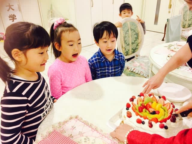 お祝い会では、みんなでニコニコ楽しく大きなケーキを食べました