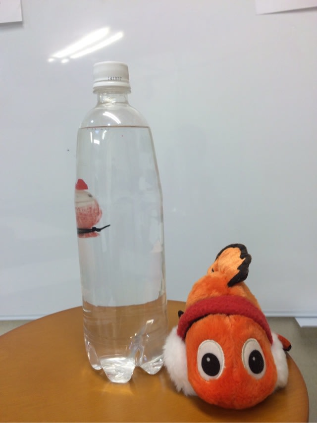 魚型の醤油入れに、空気を少し残して、水を入れたペットボトルの中に入れます。