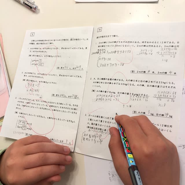 ▲小5のTくんが、連立の応用を解いています。教室では、よく見られる風景です。