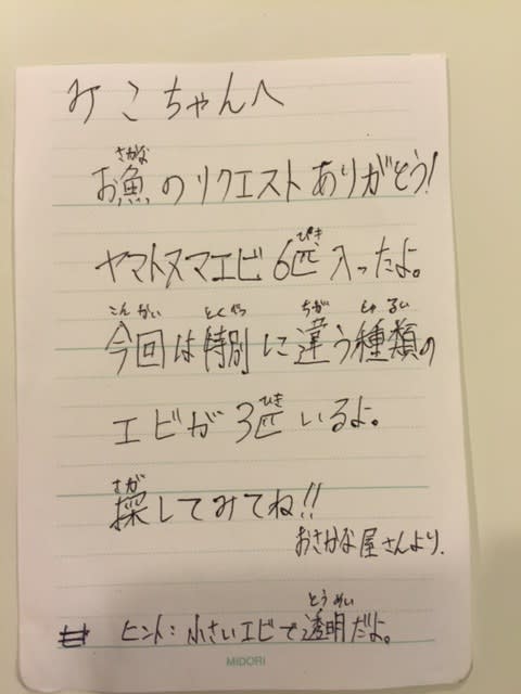 ▲おさかな屋さんからのお手紙。ほっこりしますね♪