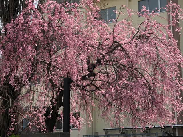 直ぐそばの4中のピンクの色の濃い桜はもう満開です
