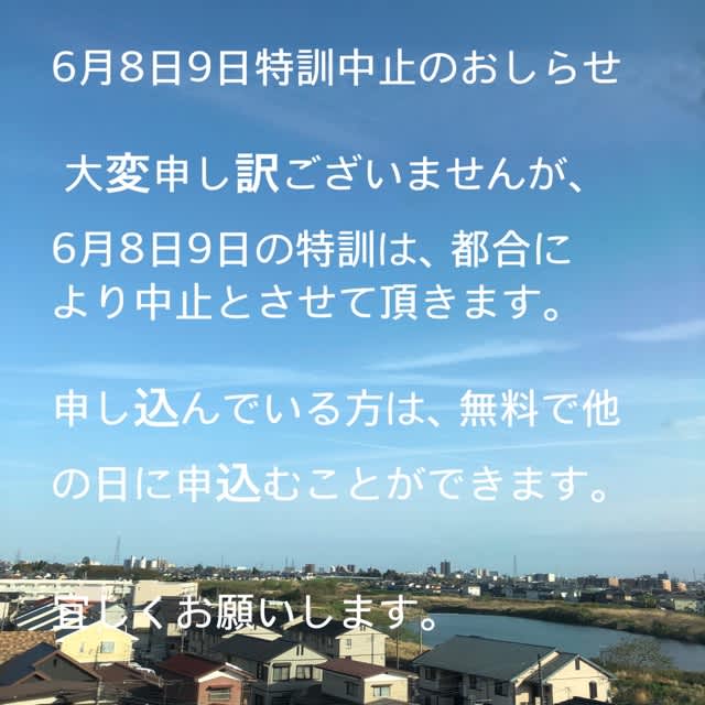 大変申し訳ございませんが、6月8日土曜、6月9日日曜の特訓は都合により中止とさせていただきます。